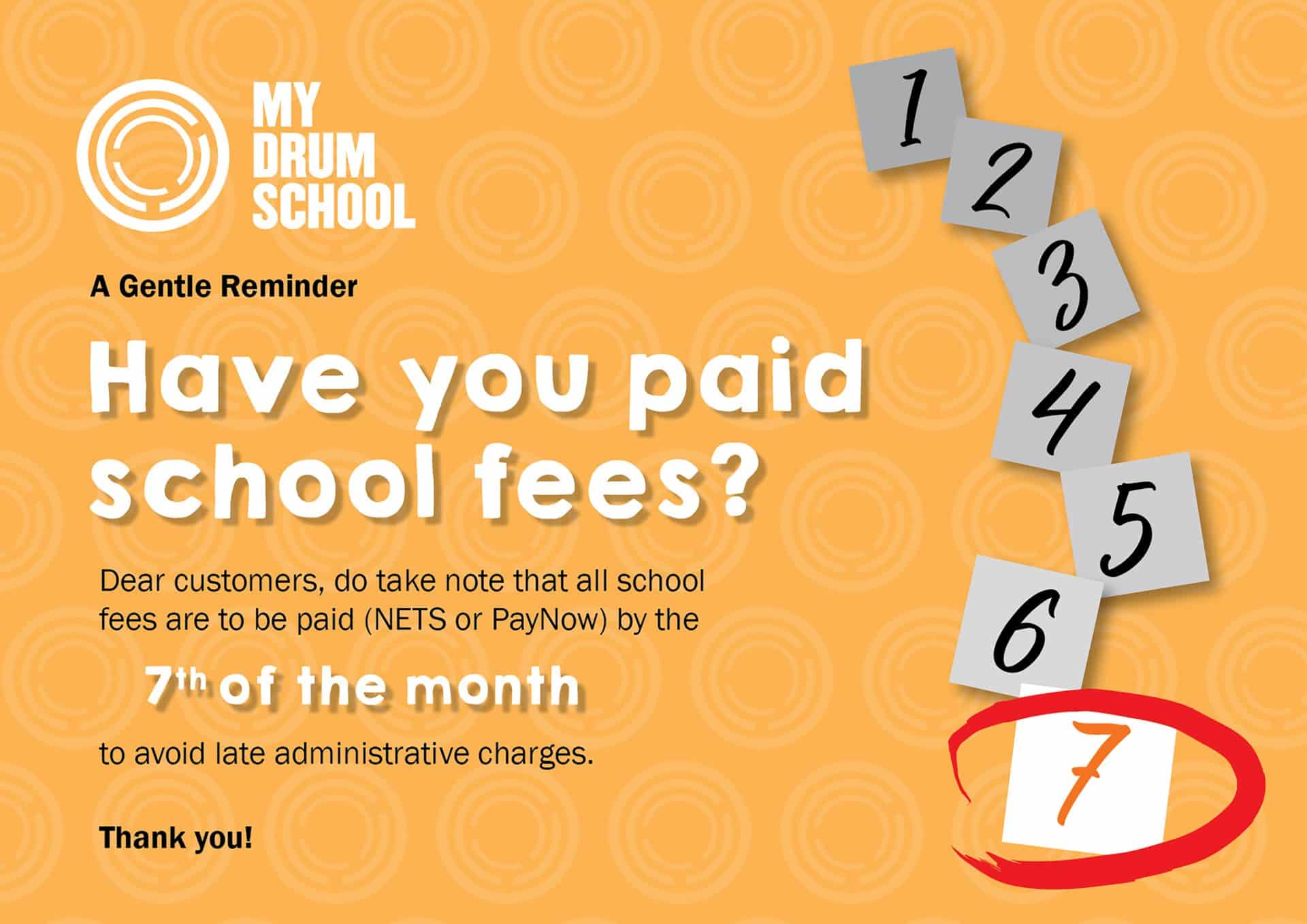 At My Drum School, we have a monthly billing process to make it easier to manage the transactions of all 900 students. Each term (3 months) consists of a total of 12 lessons. If there are 11 lessons in a particular month due to public holidays, the following term will have 13 lessons to compensate. To avoid late administration fees, we kindly request that payments are made before the 1st of each month. Thank you for your understanding.